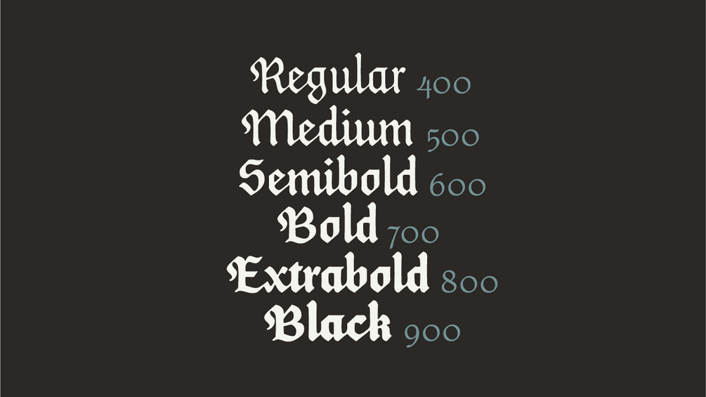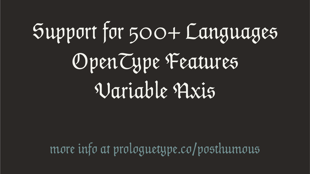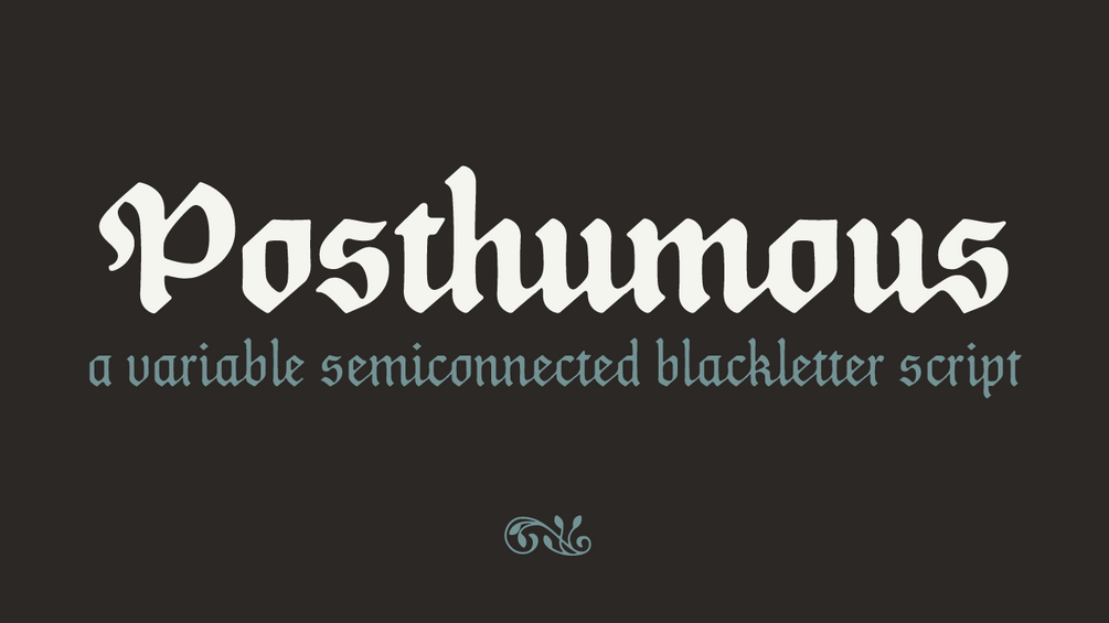 Posthumous is a variable semiconnected blackletter script. It also comes with six static weights (Regular, Medium, Semibold, Bold, Extrabold, and Black). To learn more about the font and download a PDF specimen, visit prologuetype.co/posthumous.